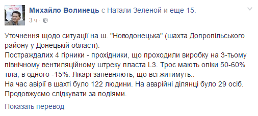 "Все четверо пострадавших - члены Независимого профсоюза горняков Украины. Мои соболезнования родным и близким пострадавших", - написал Волынец.