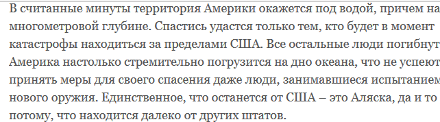 Но во время испытаний столь мощного оружия техника даст сбой, обратив все мощности боеголовок на собственную территорию. Следовательно, в считанные минуты американцы окажутся на многометровой глубине. Спастись удастся только тем, кто будет в момент катастрофы находиться за пределами США.