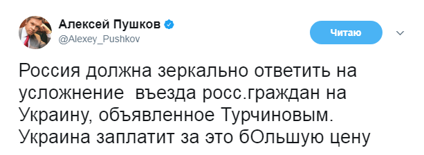 По его словам, Россия не должна оставлять без ответа возможное усложнение въезда российских граждан на территорию Украины.