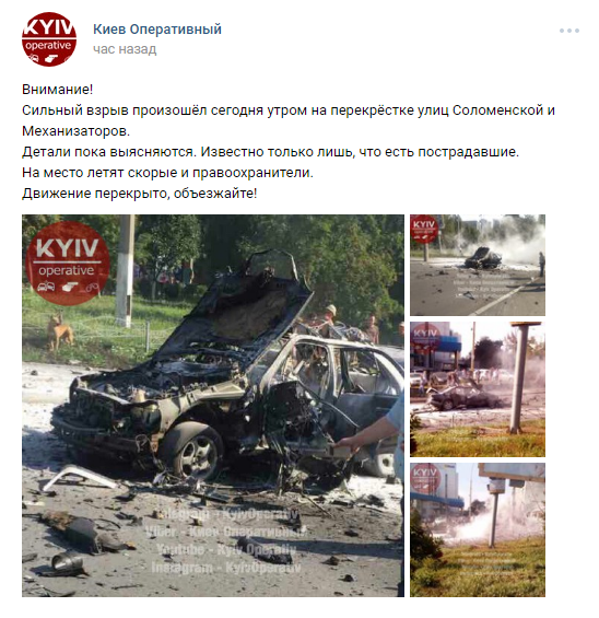 Сообщение об инциденте появилось в группе "Киев Оперативный" в соцсети "ВКонтакте" около 8:30 утра. Сообщается, что взрывное устройство сработало, когда легковой автомобиль проезжал через перекресток. Машина оказалась сильно повреждена взрывом. По предварительным данным, погиб один человек, есть пострадавшие.