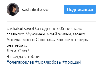 "Сегодня в 07:05 не стало главного Мужчины моей жизни, моего Ангела, моего Счастья... Как же я теперь без тебя?.. Лети, Олег! Я всегда с тобой", — написала она на своей странице в "Инстаграме".