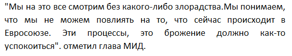 Лавров также отметил, что вопреки нагнетанию антироссийской истерии официальная Москва не злорадствует по данному поводу и ждет, пока все успокоится, и объединенная Европа будет иметь единое мнение, не основанное на стремлении построить биполярный мир.