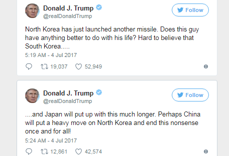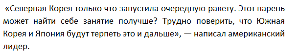 Как сообщает "Российский Диалог", Дональд Трамп подчеркнул, что Южная Корея, Япония и Китай непременно не оставят действия КНДР безнаказанными.