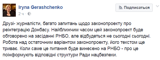 Такое уточнение сделала вице-спикер украинского Парламента Ирина Геращенко, заявившая ранее, что законопроект будет рассмотрен на заседании СНБО в ближайшие часы, сообщает "Российский Диалог".