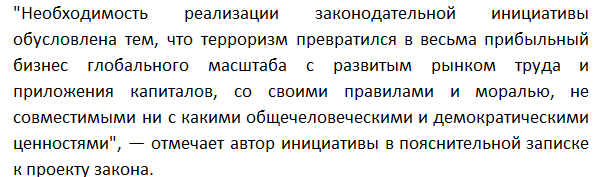 По словам депутата-"единоросса", поправка в ст. 205.1 Уголовного кодекса даст возможность гораздо более эффективно пресекать вербовку, а также иное вовлечение граждан РФ в организации и агитация их принимать активное участие в финансировании преступлений террористической направленности.