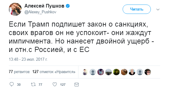 Как сообщает "Российский Диалог", Пушков подчеркивает, что Трамп оказался в весьма сложной ситуации с законом о новых антироссийских санкциях и взаимоотношениях с Европейским Союзом и Россией.