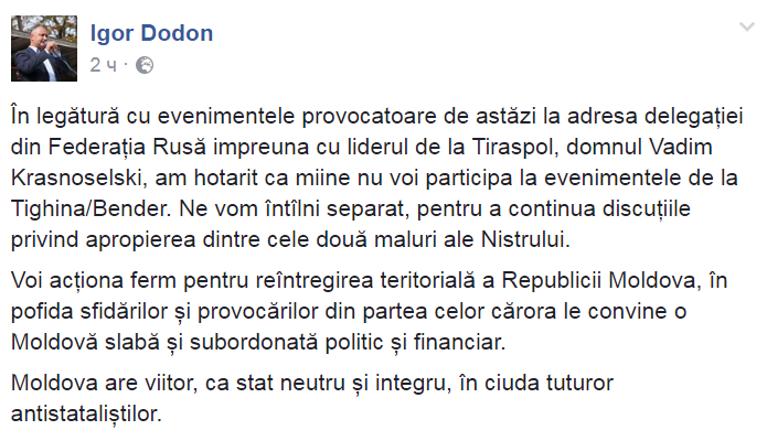 Однако встреча президента Молдавии и лидера непризнанной ПМР отложена в связи с провокационными действиями румынской стороны в адрес делегации РФ, передает "Российский Диалог" со ссылкой на заявление Додона в Facebook.