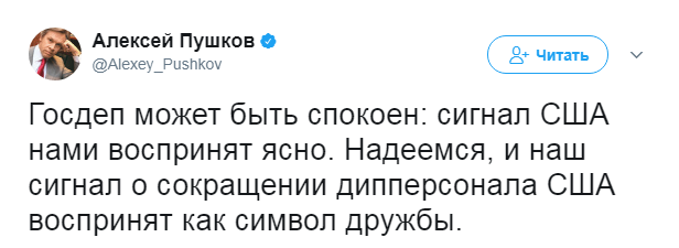 Пушков выразил надежду, что российский сигнал о сокращении дипперсонала США будет воспринят американской стороной как сигнал дружбы.