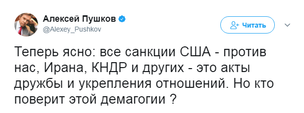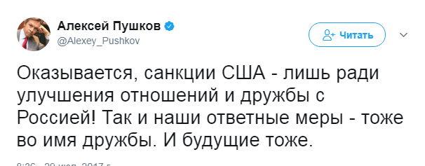 "Оказывается, санкции США - лишь ради улучшения отношений и дружбы с Россией! Так и наши ответные меры - тоже во имя дружбы. И будущие тоже", - написал сенатор на своей страннице в "Твиттере" и добавил, что американской демагогии вряд ли уже кто-то поверит.
