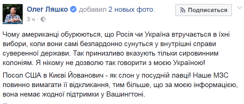 По словам Ляшко, разговаривая таким тоном, Вашингтон воспринимает Украину как сырьевую колонию.