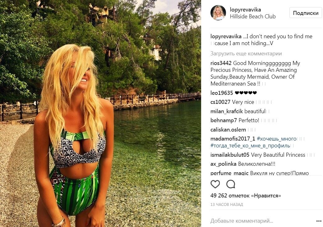 "Не нужно искать меня, потому что я не прячусь", - такой цитатой сопроводила Лопырева данный снимок.