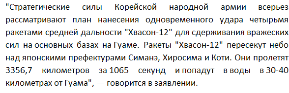 Как передает "Российский Диалог" со ссылкой на "LIGAnews", в официальном заявлении командующего стратегическими силами КНДР Ким Рак Гем заявил, что рассчитывет ударить 4 баллистическими ракетами "Хвасон-12" по авиабазе США на острове Гуам.