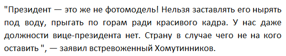 Позже фото и видеоотчеты, которые заставили Хомутинникова переживать за здоровье президента и появились на сайте Кремля.