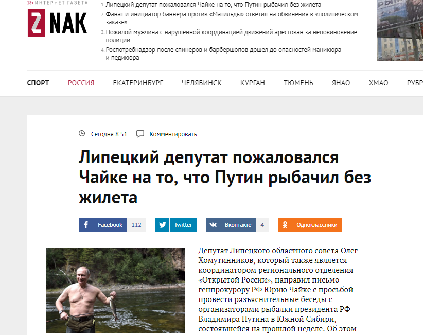 Как передает "Российский Диалог", со ссылкой на "Zнак", Хомутинников отмечает, что на фотографиях и видеозаписях с рыбалки президента можно увидеть, что Путин находился в лодке без жилета.