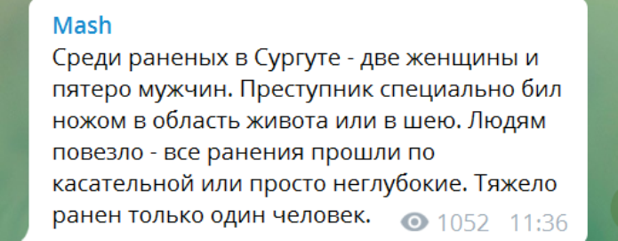 "В районе ул. Бажова идёт резня!!! Трое человек уже пострадали от ножевых ранений со стороны двух неизвестных человек, одетых в куртки с чёрными капюшонами! Один из них, по первой информации, задержан", — сообщил Олег Борисов в паблике "О, Сургут" во VK.