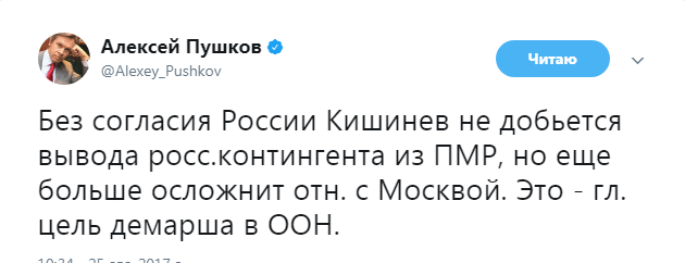 "Без согласия России Кишинев не добьется вывода росс.контингента из ПМР, но еще больше осложнит отн. с Москвой. Это - гл. цель демарша в ООН", - подчеркнул Пушков.