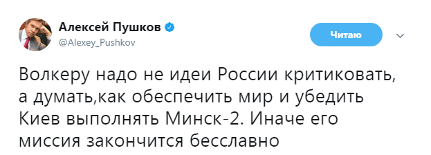 "Волкеру надо не идеи России критиковать, а думать,как обеспечить мир и убедить Киев выполнять Минск-2. Иначе его миссия закончится бесславно", - сказано в сообщении.