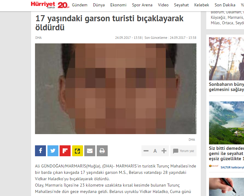 Как передает "Российский Диалог" со ссылкой на турецкой издание " Нurriyet", 28-летний турист из Белоруссии Виктор Халадко оскорбил 17-летнего официанта, не желавшего продать ему алкоголь в закрытом баре.