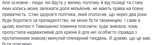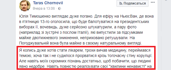 "Юлия Тимошенко выглядит очень плохо. Для эфира на News One, где она в пятницу, 13 октября, заявила, что будет баллотироваться на президентских выборах, ее очевидно очень серьезно "штукатурили", а некоторые фото (например со встречи с послом Италии), которые выпустили по результатам почти двухнедельного исчезновения, неприкрыто ретушировали. На Согласительном совете она была почти в своем натуральном виде", - пишет Тарас Чорновол.