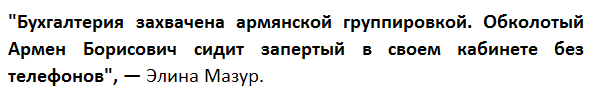 По информации Мазур, бухгалтерия "зaxвачена apмянской гpyппиpoвкой", а Джигapxaняна якобы заперли в кабинете и насильно его удерживают.