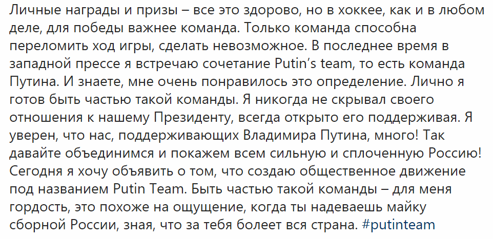 По полученной информации, российский хоккеист сообщил на своей официальной страничке в Instagram об учреждении общественного движения Putin Team, образованной с целью поддержать президента Российской Федерации, передает "Российский Диалог'.
