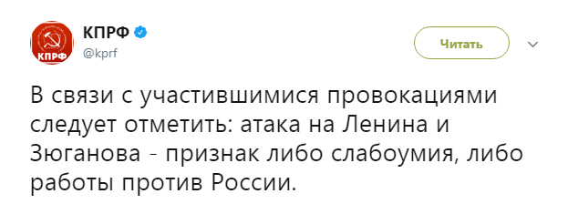 "В связи с участившимися провокациями следует отметить: атака на Ленина и Зюганова - признак либо слабоумия, либо работы против России", - сказано в сообщении.