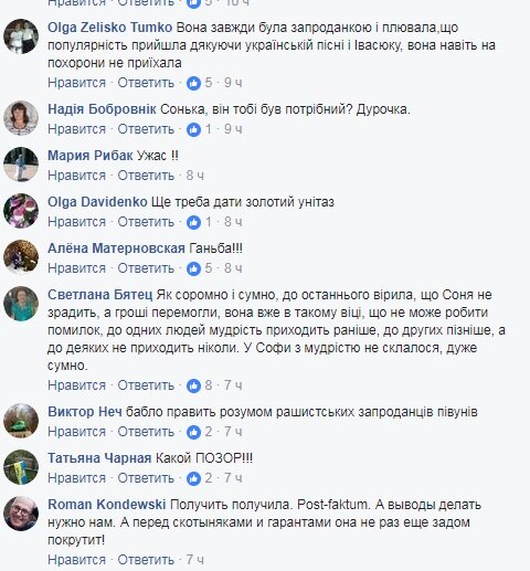 "Предательница!", "Продажная тварь", "Нет слов… Убожество", "То, что сделала София Ротару, недопустимо герою и народному артисту Украины. Получила награду из рук врага – Захаровой. Обрыгаться можно", - выразилась публика в Сети.