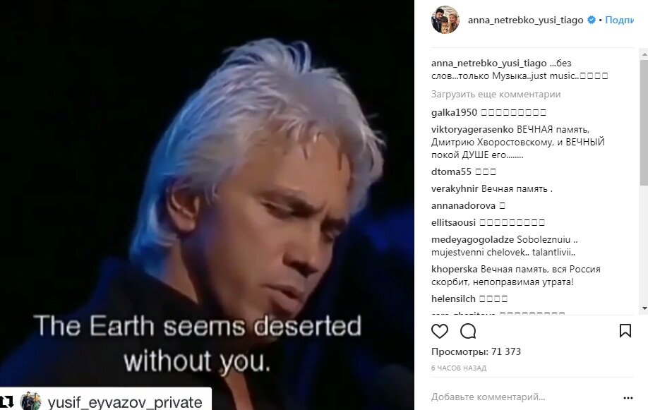 На своей официальной странице в социальной сети "Инстаграм" оперная дива опубликовала видеоролик. На кадрах знаменитый баритон исполняет композицию "Нежность", которая больше всего известна как "Опустела без тебя Земля". Свое видео Нетребко сопроводила комментарием "..без слов... только Музыка.. just music.. ".