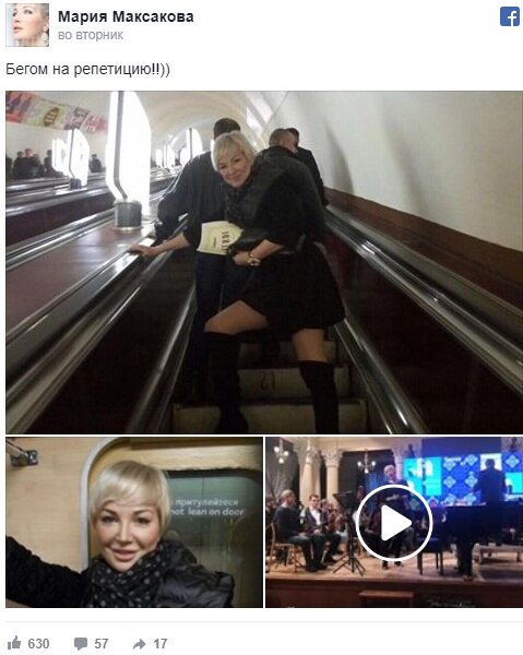 Судя по всему, исполнительница решила прервать долговременное молчание, которое недавно царило на ее официальной странице в социальной сети "Фейсбук". Она выставила фотографию из метро, рассказав фолловерам, что спешит на репетицию. Примечательным стало то, что на кадре Максакова позирует на эскалаторе в черном полушубке, который открывает вид на ее стройные ноги в ботфортах.