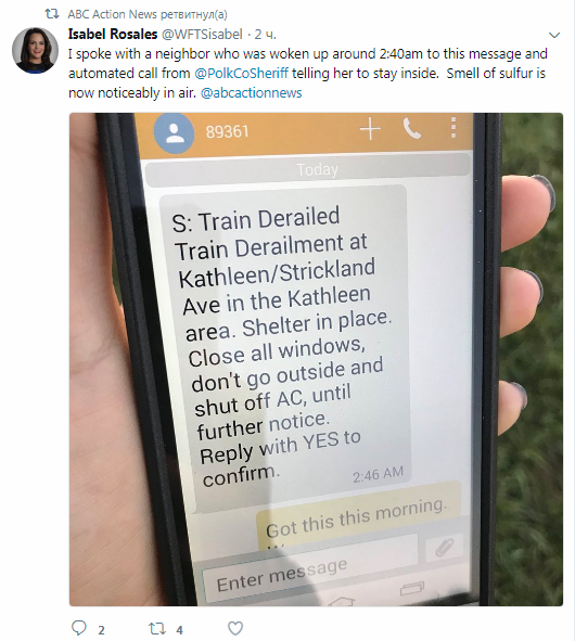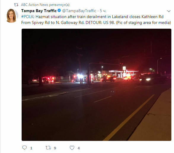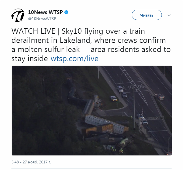 Как стало известно, в американском штате Флорида, расположенном на юго-востоке страны, в городе Лейкленде поезд, перевозивший токсические химические вещества, сошел с рельсов, спровоцировав чрезвычайное происшествие, в результате которого расплавленная сера, содержащаяся в цистернах, попала в окружающую среду, передает "Российский Диалог".