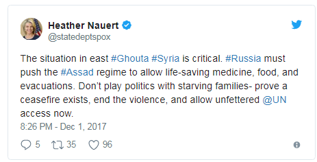 "Не играйте в политику с голодающими людьми - докажите, что перемирие существует, остановите насилие и откройте доступ для ООН", - говорится в сообщении представителя Госдепа.