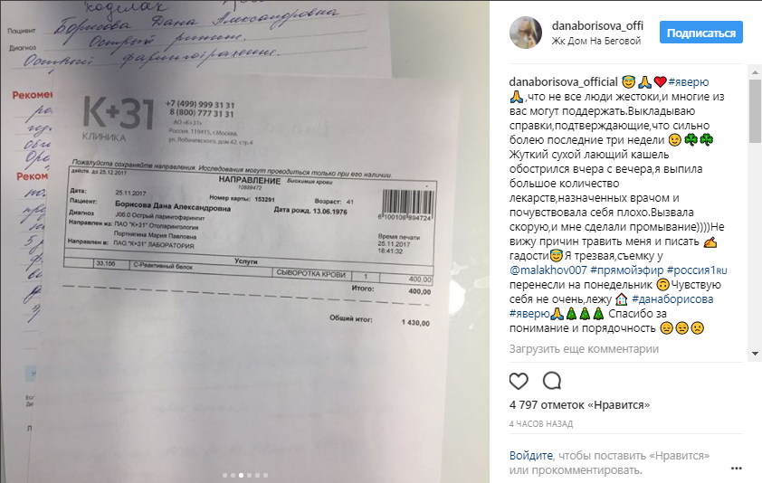 "Острый ларингофарингит", - именно такой диагноз поставили медработники. Доказательством этому является больничная выписка, которую и опубликовала Дана Борисова в соцсети.