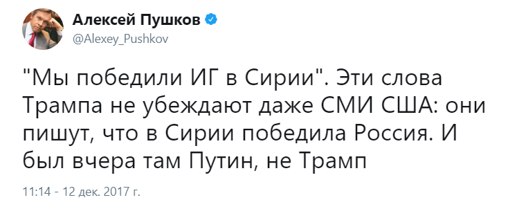 "Они пишут, что в Сирии победила Россия. И был вчера там Путин, не Трамп", - заметил он.