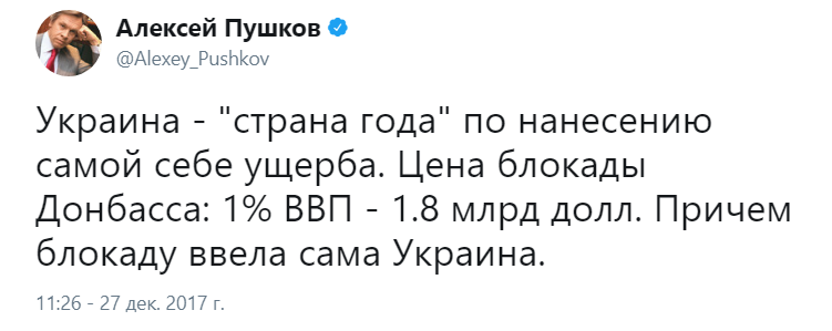 "Украина - "страна года" по нанесению самой себе ущерба. Цена блокады Донбасса: 1% ВВП - 1.8 млрд долл", - написал он.
