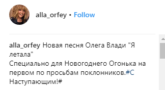 На своей официальной странице в социальной сети "Инстаграм" Алла Борисовна призналась, что приняла участие в "Новогоднем огоньке" на "Первом канале". Для участия в программе Примадонна выбрала песню Олега Влади "Я летала".