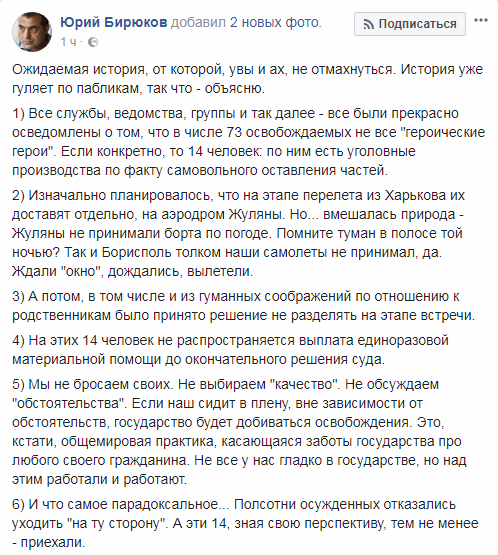 По информации, размещенной на официальной странице украинского политика в социальной сети Facebook, Бирюков рассказал, что все спецслужбы страны совместно с прочими ведомствами были в курсе, что из 73 освобожденных по обмену солдат 14 не являются "героическими героями" - в их отношении уже открыты уголовные дела по факту дезертирства из места прохождения службы.