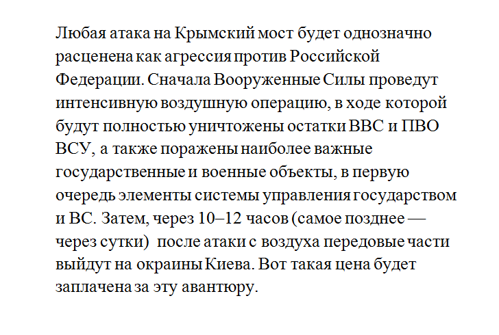 Украине напомнили, что Крымский мост, как и вся территория Российской Федерации, надежно защищен средствами противовоздушной обороны. Кроме этого, любая атака на вышеуказанный объект будет расценена Москвой как агрессия против страны.