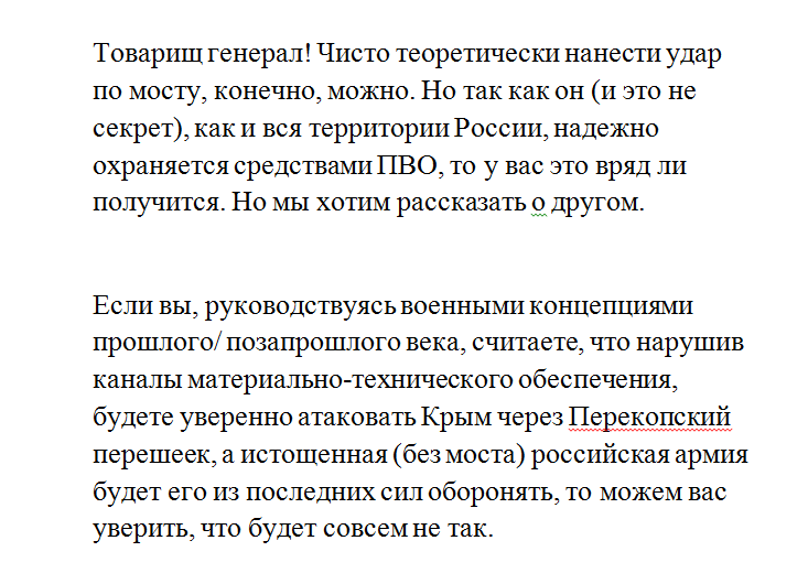 В телеграм-канале "Майор и Генерал" опубликован "неофициальный ответ" на выступление бывшего заместителя начальника Генерального штаба Вооруженных Сил Украины генерал-лейтенанта Игоря Романенко, который указал на уязвимость моста через Керченский пролив с военной точки зрения, передает "Российский Диалог".