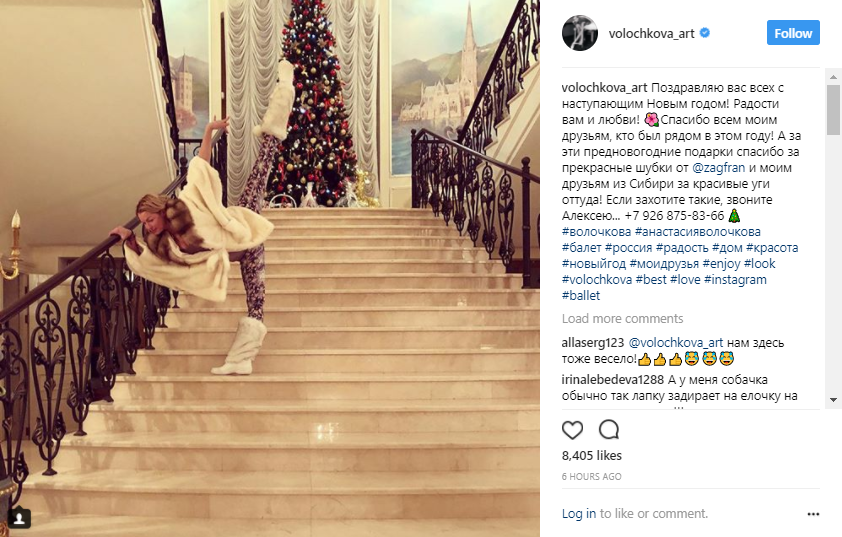 Данный снимок танцовщица обнародовала на своей странице в соцсети Instagram. На нем она запечатлена на лестница. Балерина, одетая в шубу бежевого цвета и белые уги, делает свой знаменитый шпагат на фоне новогодней елки.