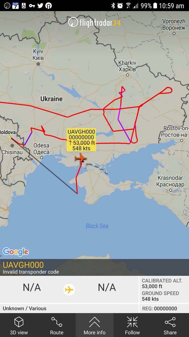 Беспилотник вошел в воздушное пространство Украины со стороны Румынии. В Сети опубликованы кадры, на которых запечатлен маршрут RQ-4A Global Hawk.