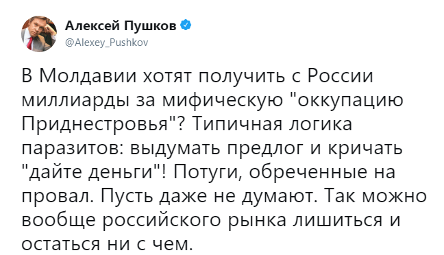 "В Молдавии хотят получить с России миллиарды за мифическую "оккупацию Приднестровья"? Типичная логика паразитов: выдумать предлог и кричать "дайте деньги"! Потуги, обреченные на провал", - прокомментировал сенатор.