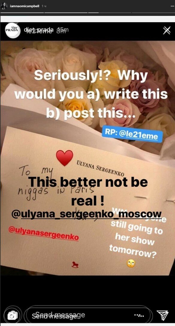 В социальной сети "Инстаграм" Наоми опубликовала"инстастори", где было изображено то самое приглашение на модный показ с некорректным высказыванием. Подписала снимок модель довольно гневными фразами: "Серьезно??? Зачем вы а) написали это; б) опубликовали это...", "Лучше бы это не было правдой!", "Вы все еще собираетесь на ее шоу завтра?"