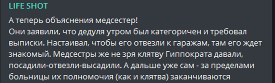 Тем временем в Сети уже появились объяснения действий тех самых медсестер, которые были запечатлены на видео на выбрасывании пациента к двери гаража. Виновным в этой вопиющей ситуации они назвали того самого старика, который якобы требовал выписки.