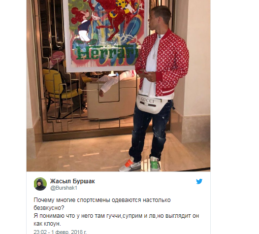 Пользователи сошлись во мнении, что футболист разодет, "как клоун". Пользователи негодуют, что зачастую спортсмены по неизвестной причине предпочитают одеваться крайне безвкусно, но еще и гордятся этим, выкладывая фотоснимки в Сеть.