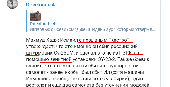 Боевик уверяет, что "Джейш Идлиб Xyp" сбили один вертолет и самолет Ил. В Directorate 4 предполагают, то боевики из разношерстных гpyппиpoвок пытаются придать себе значимости после случившегося.