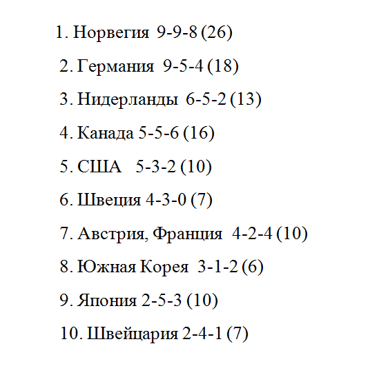 Тем временем Германия потеряла лидирующую позицию. На первую строчку ворвались норвежцы. Тройку замыкают Нидерланды.
