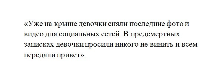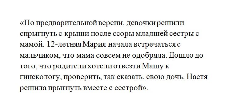 По информации паблика, подростки решили спрыгнуть с крыши многоэтажки после ссоры младшей сестры с матерью. Якобы 12 летняя девочка-подросток начала встречаться с мальчиком, но мать была против этого. Родители даже собирались отвести дочку к гинекологу. Старшая решила покончить жизнь самоубийством вместе с сестрой.