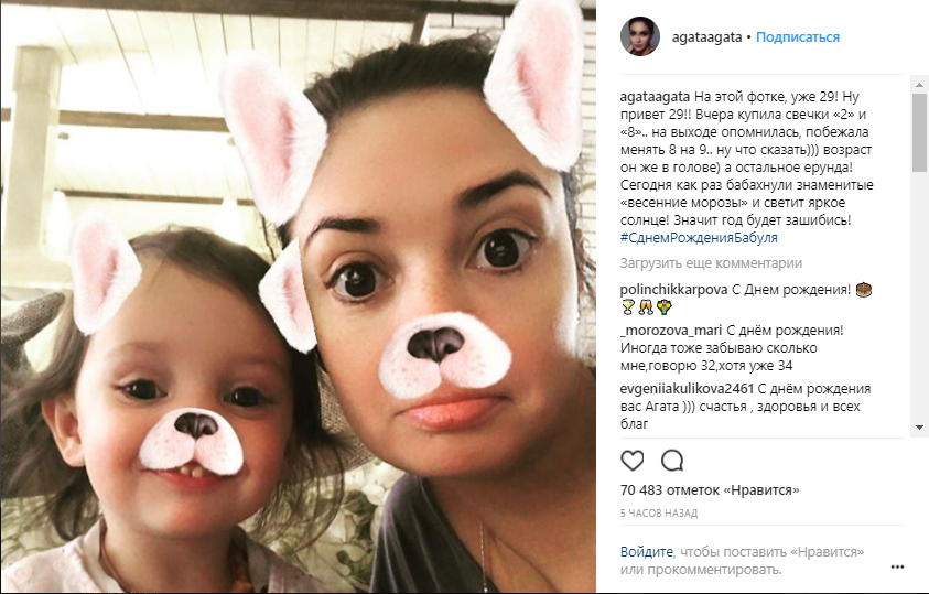 "С днем рождения Вас, Агата))) Счастья, здоровья и всех благ", "С Днем Рождения, Агаточка!!! Ты умница, ты многого добилась, много успела, самое главное у тебя есть твоя семья, прекрасные детки, супер-пупер муж", "С Днем Рождения, девушка-весна! Оставайтесь такой солнечной, яркой, жизнерадостной, игривой и, самое главное - здоровой!!!" - написали в комментариях подписчики актрисы.
