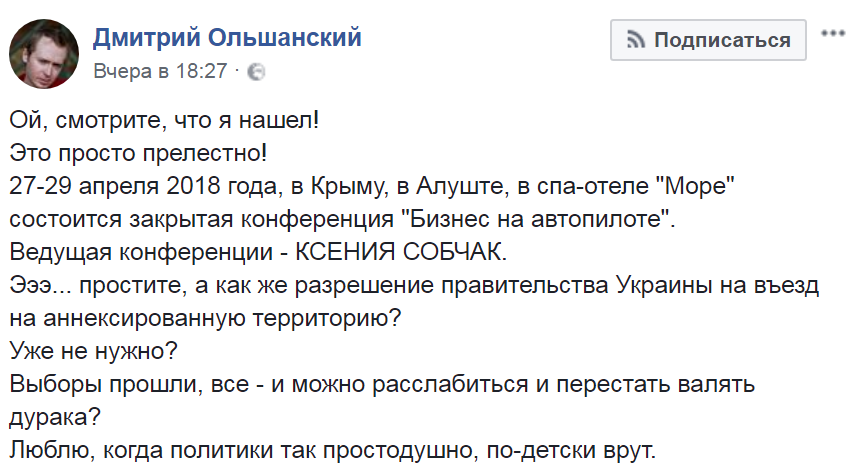 Публицист обратил внимание на тот факт, что до президентских выборов Собчак заявляла о намерениях посещать Крым только с "разрешения" Киева.