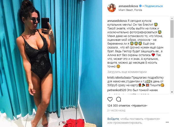 "Я сегодня купила купальник мечты! Он так блестит. Такой, знаете, чтобы выйти на пляж и исключительно фотографироваться. Меня даже не остановило то, что Мона, оценивая мой образ, спросила не беременна ли я", - пишет Анна на своей странице в соцсети Instagram.